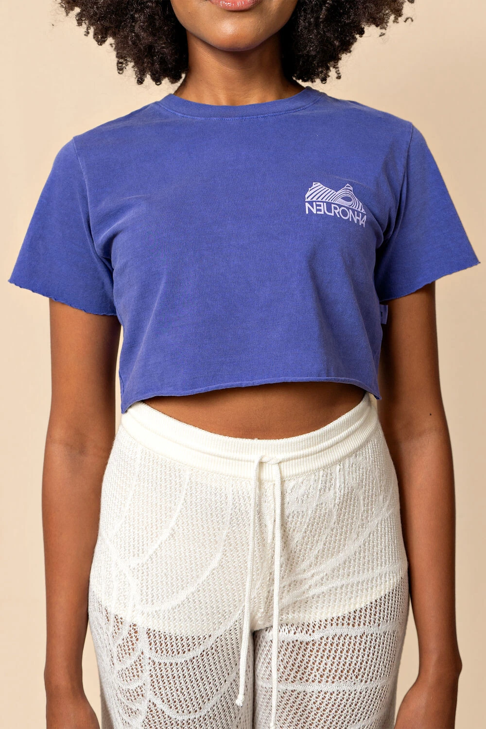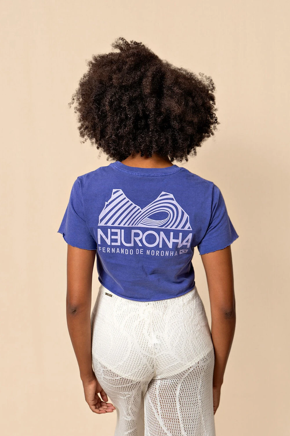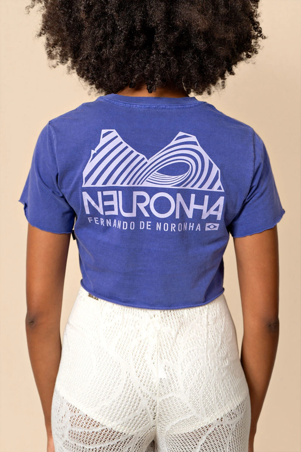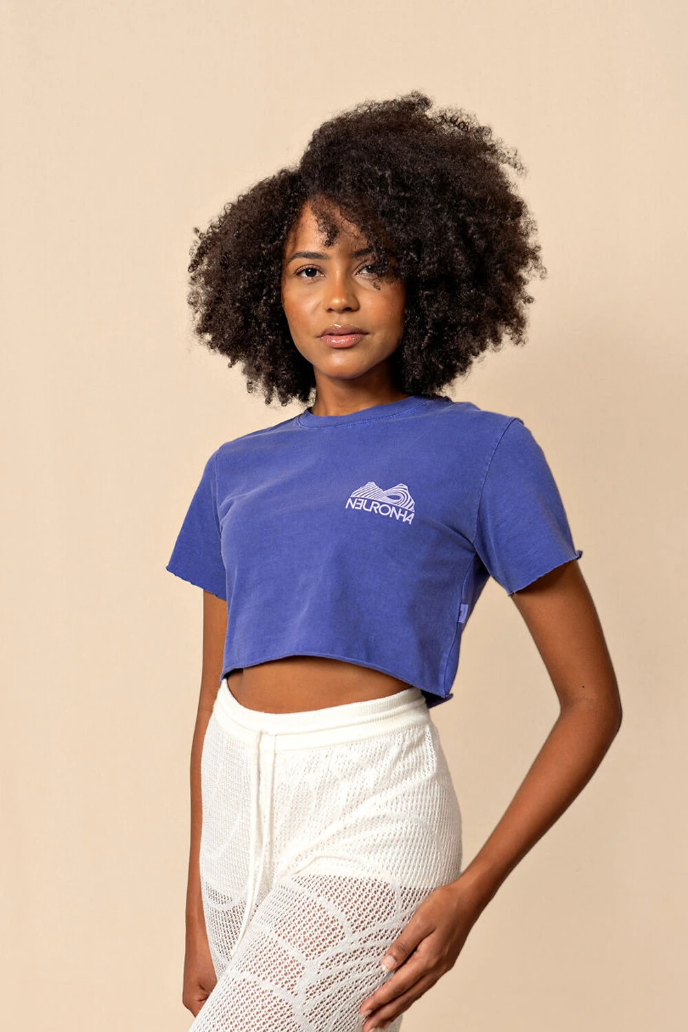 Cropped estonado confeccionado em malha 100% algodão certificado, com toque macio, pré-lavado e tingido artesanalmente, deixando um leve perfume que remete à brisa suave da ilha Fernando de Noronha. Modelagem despojada, quadrada com mangas curtas e acabamento em corte a fio que dá um charme especial à peça.