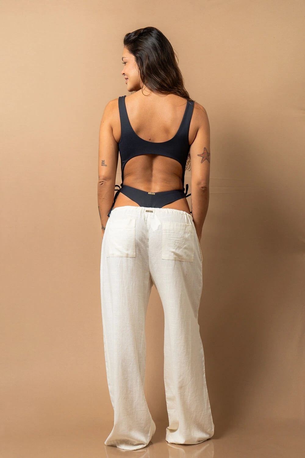 Confeccionada em viscolinho, possui modelagem ampla e reta, garantindo movimento e fluidez em cada passo. O cós ajustável com cadarço proporciona um caimento personalizado, enquanto os bolsos laterais e traseiros aplicados unem praticidade e estilo.