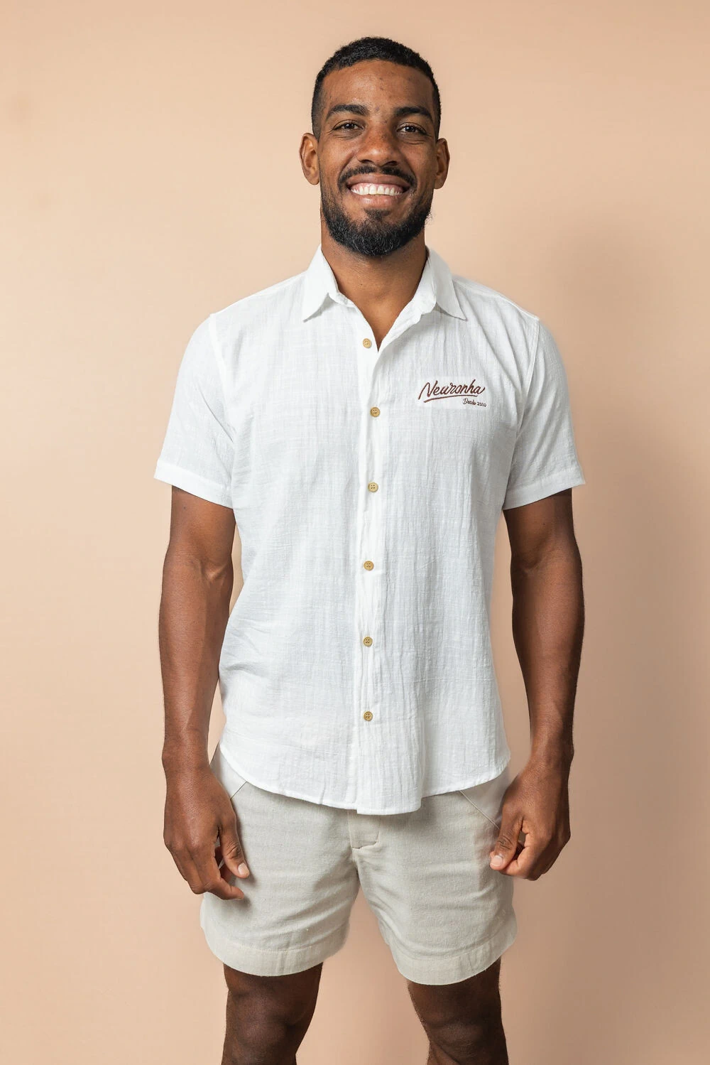 A Camisa de Botão Cotton da Neuronha é uma peça exclusiva que celebra os 15 anos de história da marca, unindo a tradição do ilha com um design contemporâneo e atemporal.